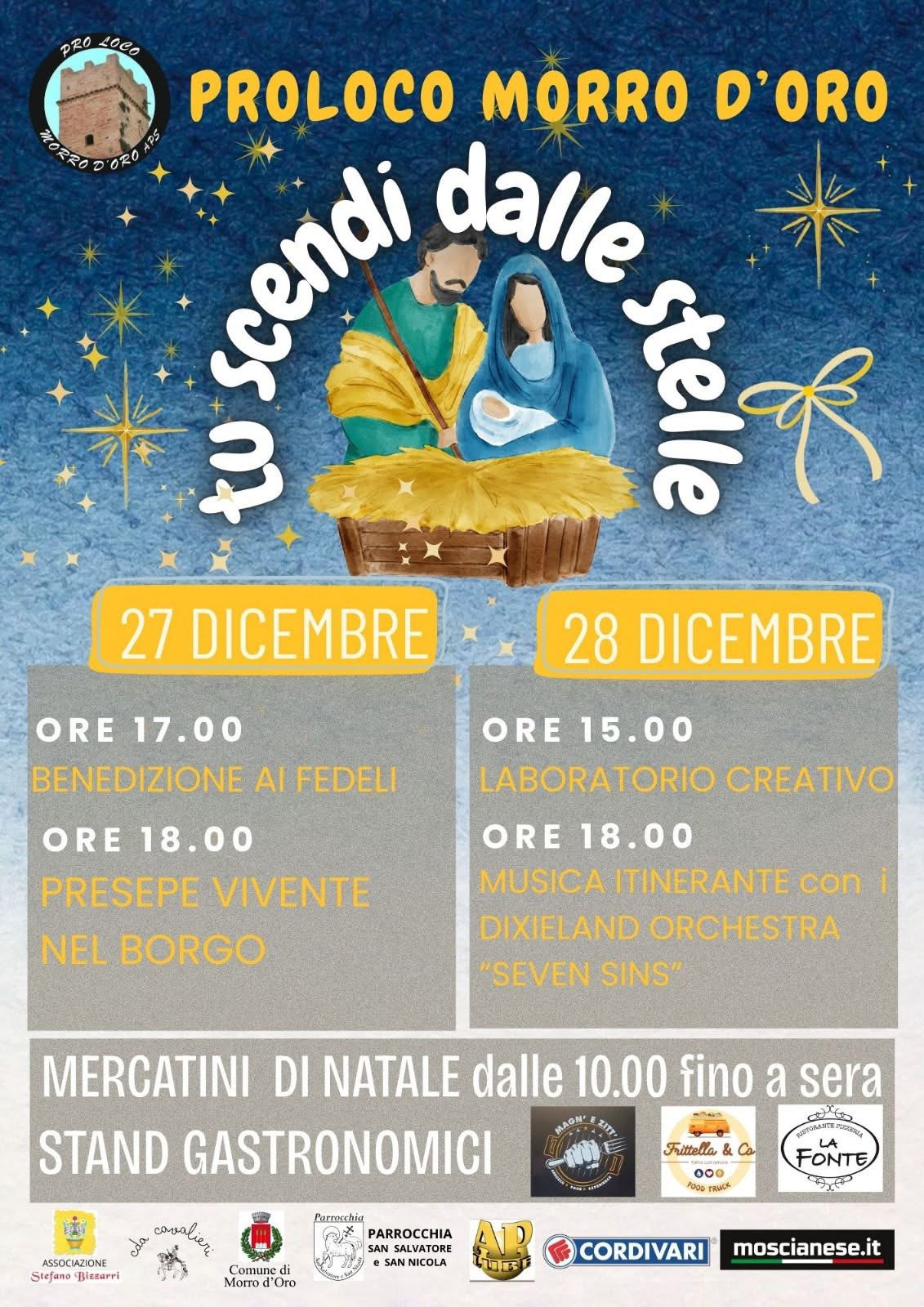 La manifestazione “Tu scendi dalle stelle” si svolgerà il 27 e il 28 dicembre 2025 a Morro d’Oro 📅📍 e si inserisce nel calendario delle iniziative natalizie del Comune, contribuendo a rendere il paese un luogo di accoglienza e condivisione durante le festività natalizie 🎄✨.